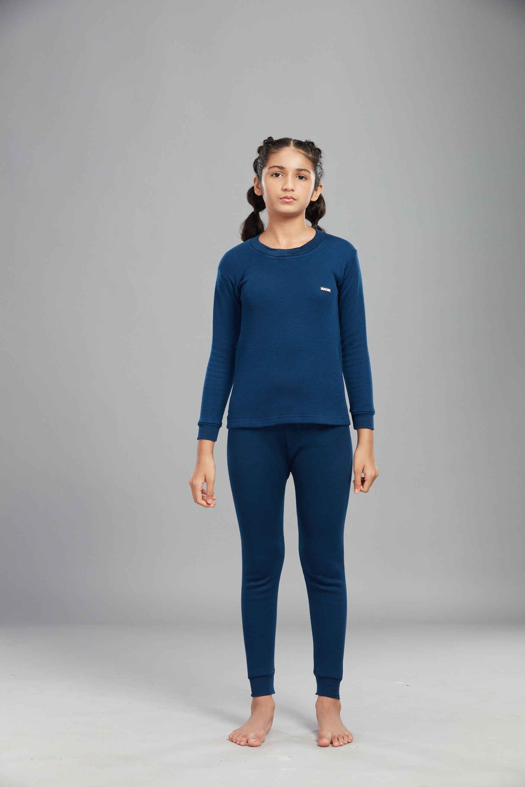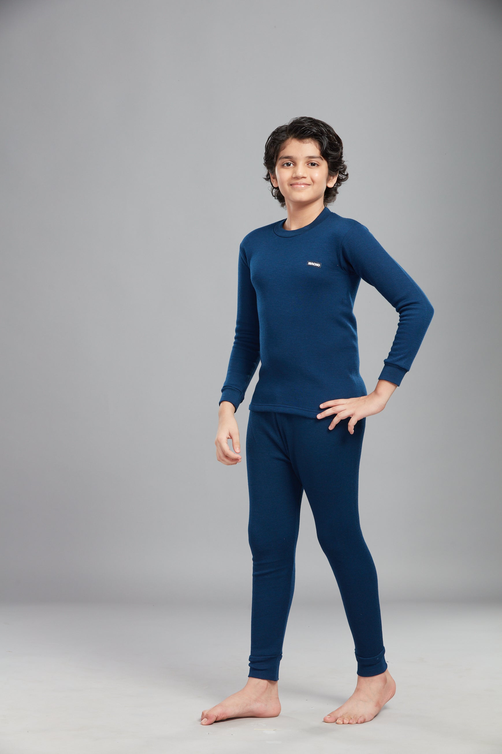 The outer elastic waistband ensures a secure yet adjustable fit that adapts with movement, while the cuffed bottoms help retain heat and prevent cold air from entering. These thermal pants childrens styles pair perfectly with children's thermal tops, children's thermal vests or even sleeveless thermal for kids to create a complete winter outfit. The navy blue colour offers a clean, versatile look that matches easily with jumpers, jackets or school uniforms.