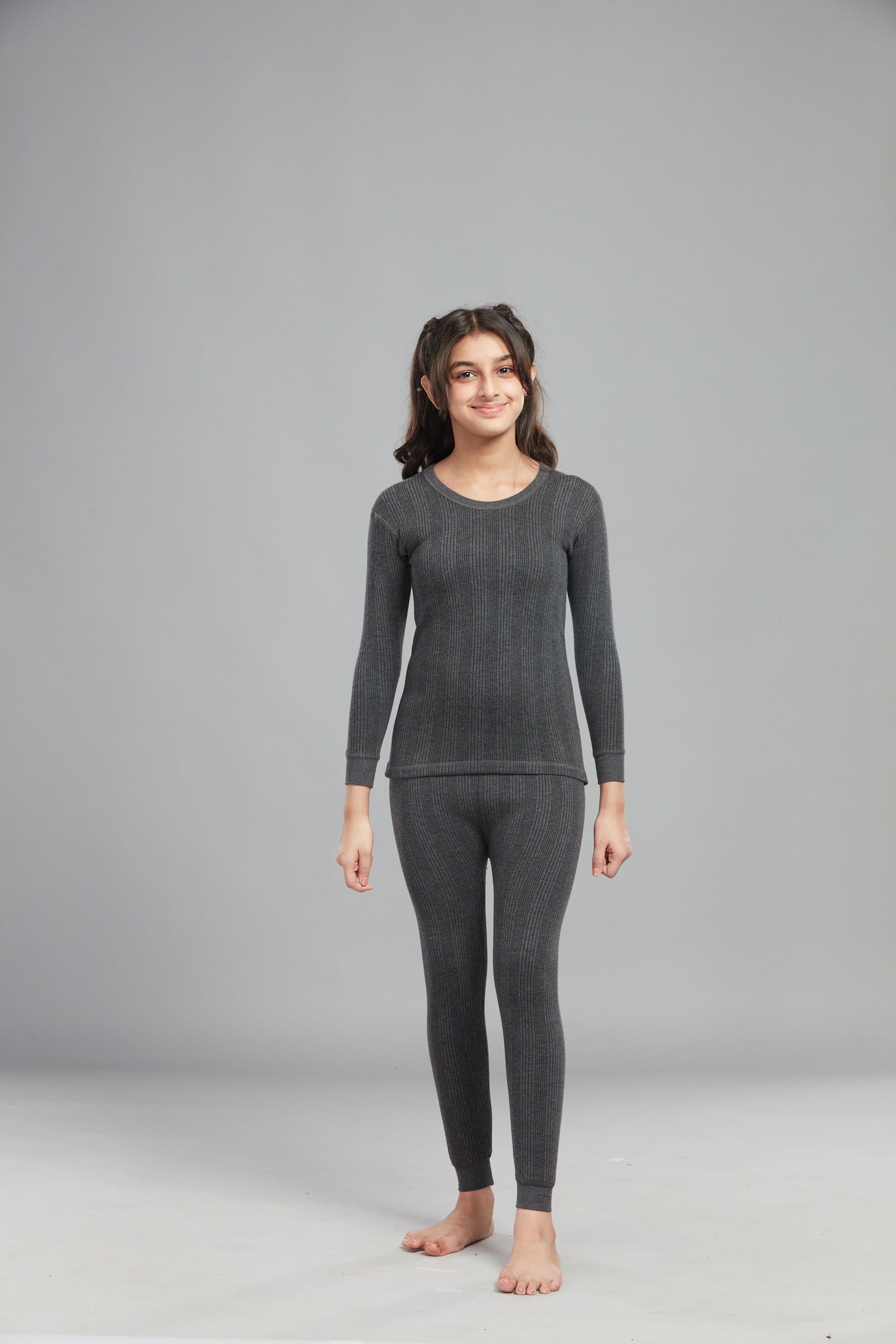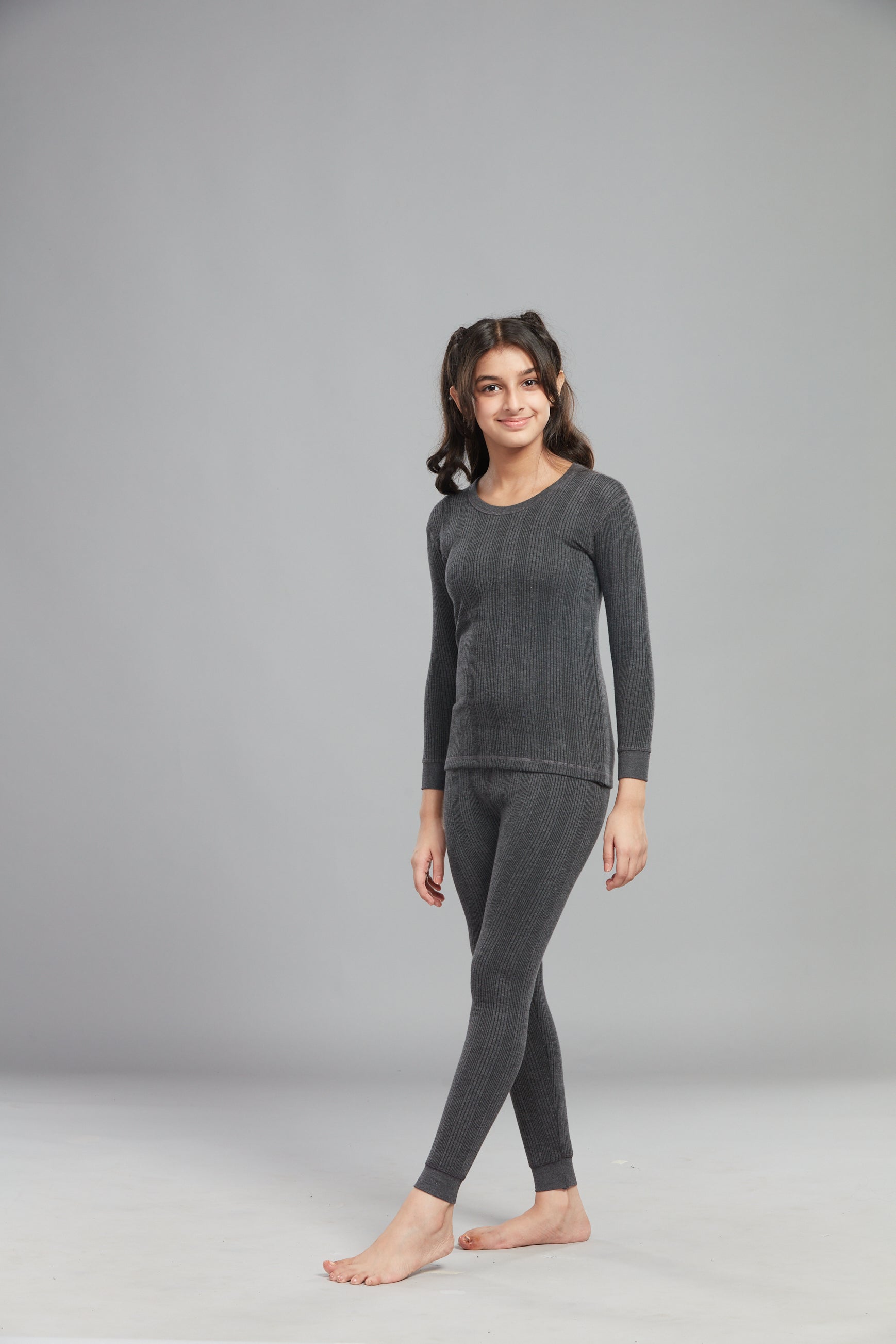 A secure inner elastic waistband ensures a comfortable fit that adapts easily to movement, while the cuffed bottoms add a stylish, tapered finish that helps retain warmth. Designed as practical thermal pants childrens love wearing, they offer a great balance of flexibility and ease, making them suitable for school, playtime and everyday activities. Available in versatile charcoal colour, they pair effortlessly with T-shirts, jumpers or sleeveless thermal for kids.