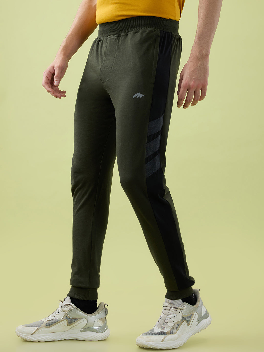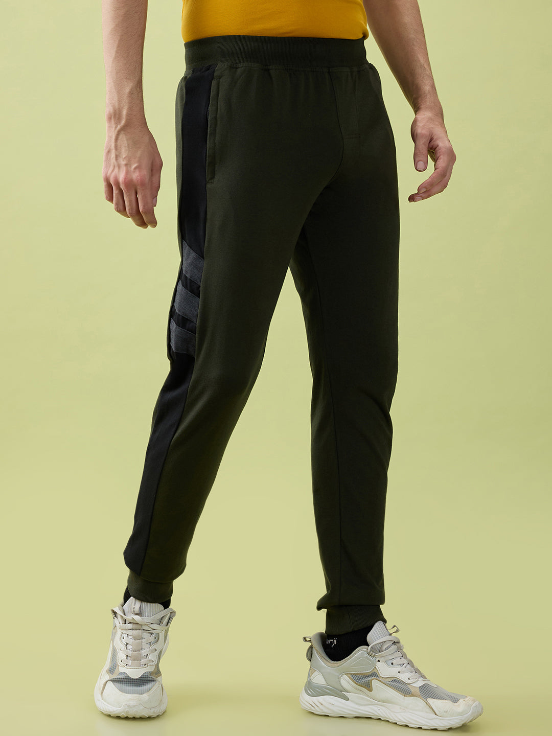 Shop the Men’s Joggers with Contrast Side Panel, Zippered Pockets & Ribbed Waist in Olive colour.