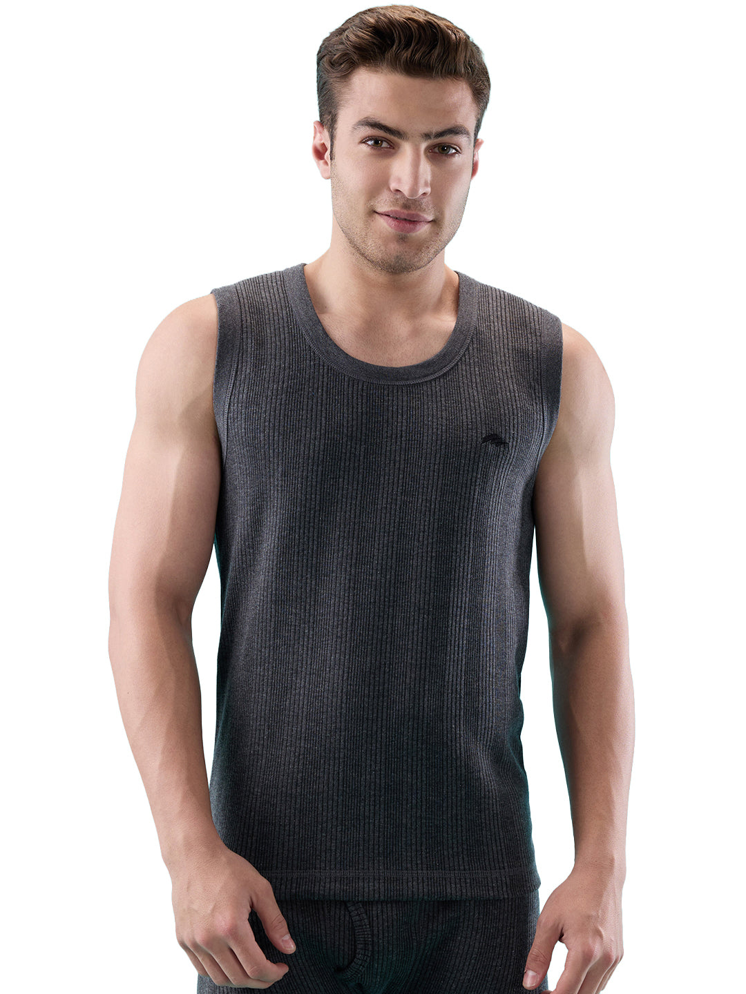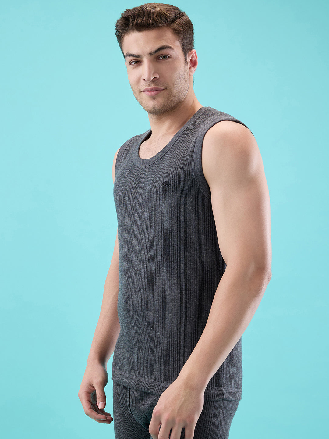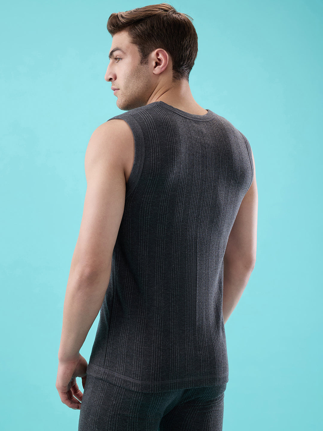 Its sleeveless design allows unrestricted movement, while elastane ribbing at the neck and armholes offers a flexible, secure fit that maintains shape over time. The charcoal colour adds a modern, understated look that pairs effortlessly with various outfits, making it a staple piece in thermal wear for men.