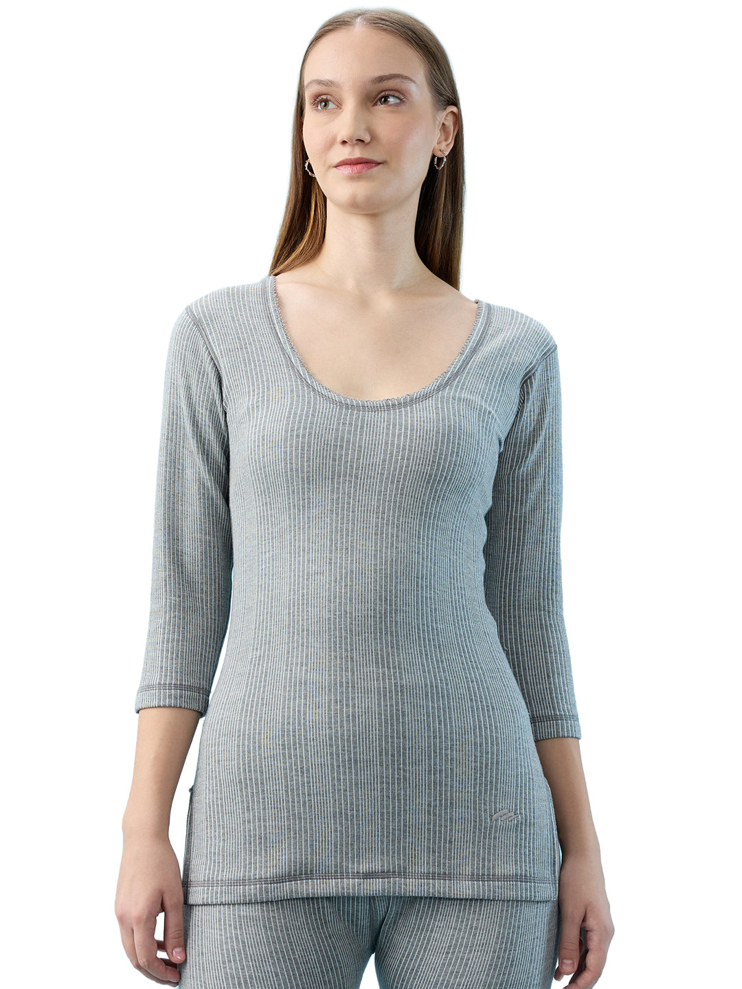 The deep R-neck enhances the overall feminine look, while elastane ribbing at the neckline and cuffs ensures a secure, shape-retaining fit. The 3/4th sleeves offer a stylish blend of coverage and ease, making this heated vest top both practical and elegant for daily wear. Available in a versatile grey colour, it pairs effortlessly with a wide range of wardrobe choices.